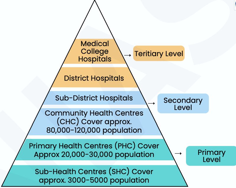 - India's public healthcare system is structured in three tiers.
