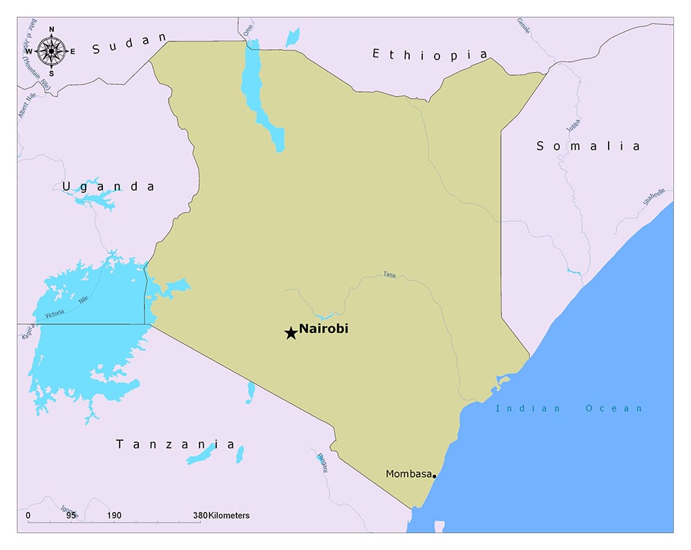 - Political boundaries in the capital city are located on the East Africa coast and are bordered by the Indian Ocean to the east, Somalia to the east, Ethiopia and South Sudan to the north, and Uganda and Tanzania to the west and south respectively.