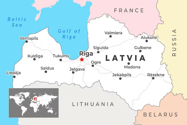 - Land boundaries with Estonia (North), Russia (East), Belarus (southeast), and Lithuania (South).