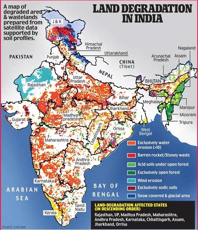 • Around 23.95% of desertification/land degradation is contributed nine states:  Rajasthan, Maharashtra, Gujarat, Jammu & Kashmir, Karnataka, Jharkhand, Odisha, Madhya Pradesh and Telangana.