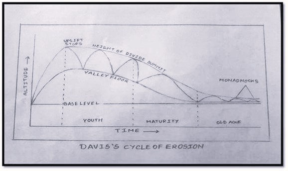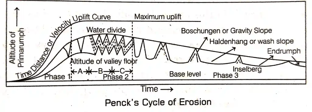 Discuss in detail the ideas of geomorphic cycle proposed by Davis and Penck. IAS 2024, 15 Marks