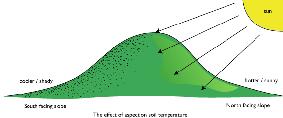 - Slopes facing away from the Sun are sheltered from direct insolation, and so tend to have cooler, moister soils.