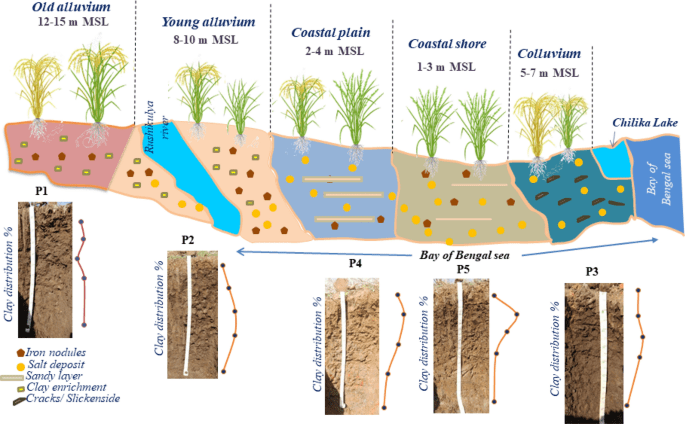 - In a normal toposequence, soil at the hilltop is red. As we move down, it gradually changes into brown and then yellow.