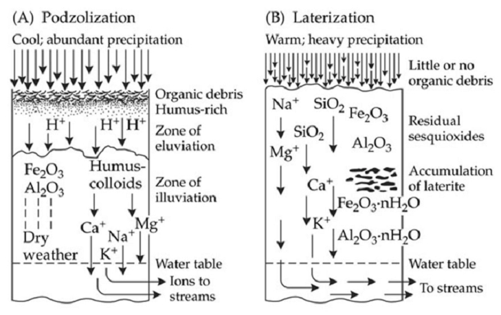 - In the Podozolization process, iron and aluminium move downward to form acidic soils.