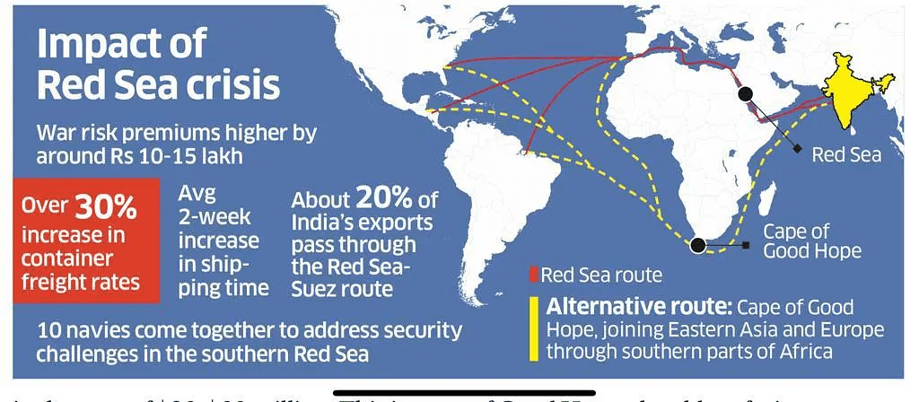 • लाल सागर में सुरक्षा संकट से पहले, यूरोप में भारत का ईंधन निर्यात लाल सागर-स्वेज नहर मार्ग पर बहुत अधिक निर्भर था।