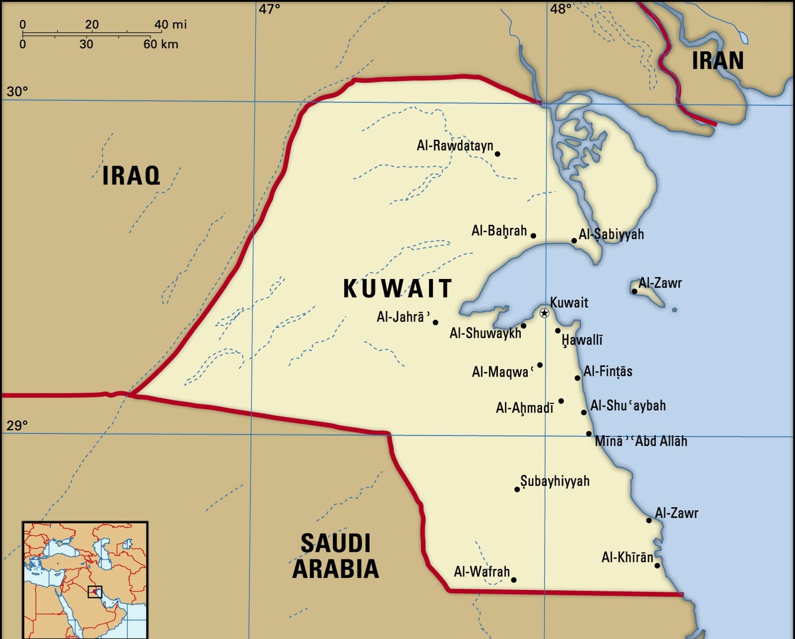• स्थलाकृति: कुवैत खाड़ी के पश्चिमी छोर पर अल-जहरा नखलिस्तान के साथ मुख्य रूप से रेगिस्तान