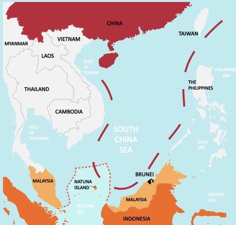 - नौ-डैश लाइन दक्षिण चीन सागर में चीन के विस्तृत दावों का प्रतिनिधित्व करती है, जो लगभग 90% क्षेत्र को कवर करती है और ब्रुनेई, इंडोनेशिया, मलेशिया, फिलीपींस, ताइवान और वियतनाम जैसे अन्य देशों के दावों के साथ अतिव्यापी है।