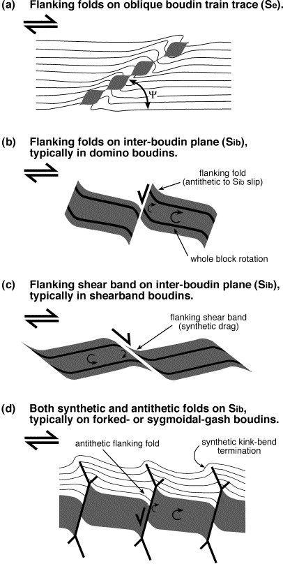 • Fold hinges may show thickening, while fold limbs are boudinaged due to extension.