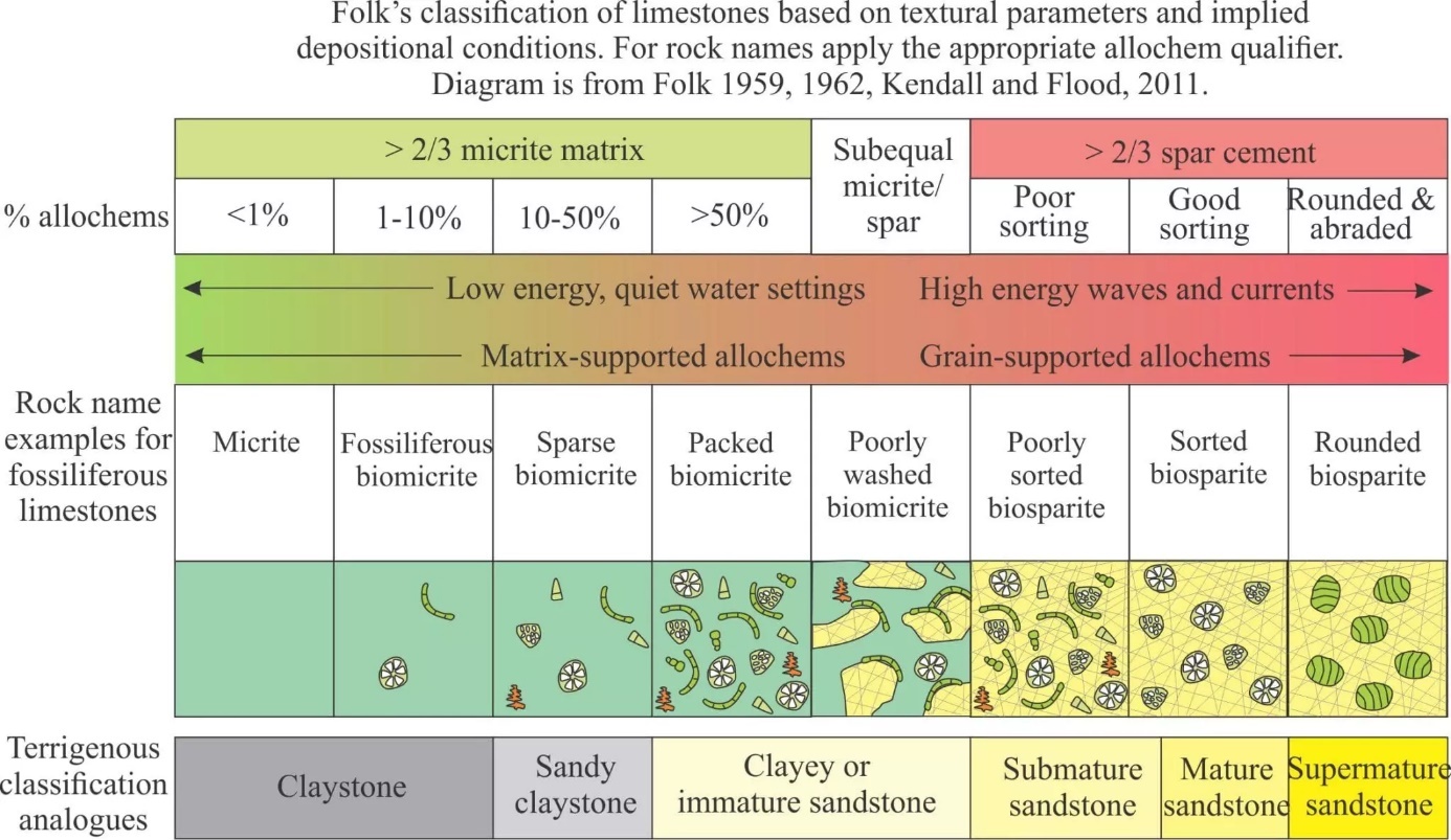 - Rocks are classified based on the proportion of allochems, micrite, and sparite.