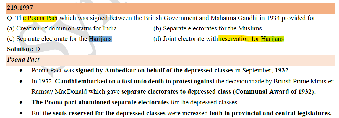 ○ The Poona Pact was an agreement reached on September 24, 1932, between Mahatma Gandhi and Dr. B.R. Ambedkar on behalf of the depressed classes and upper-caste Hindu leaders on the reservation of electoral seats for the depressed classes in the legislature of British India.